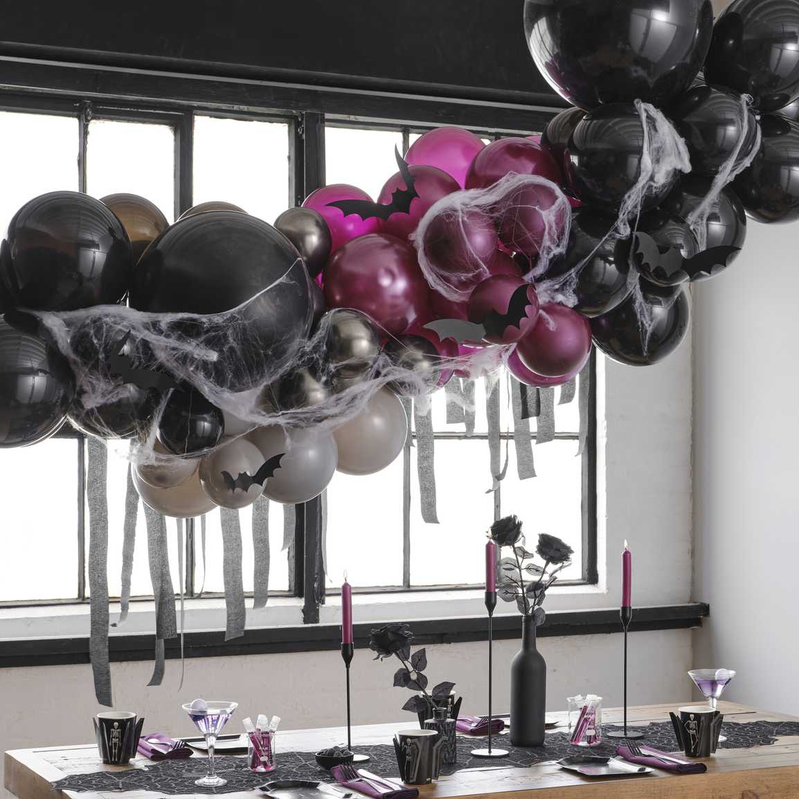 Once you have the basics in place, you can add other spooky accents to your halloween party table to complete the look. For example, you could scatter fake spiders and webs around the table, or place a few skull candlesticks or candy dishes. You could also hang a Halloween banner or streamers from the ceiling. Check out our halloween balloon arches for a real wow effect.