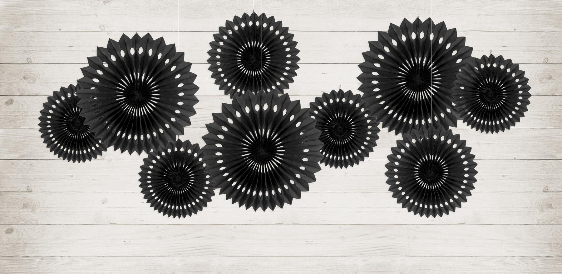 Decorative rosettes made of tissue paper in black colour, diameters when assembled approx. 20 cm, 25 cm, and 30 cm. Reusable product. Assembly with a clip.