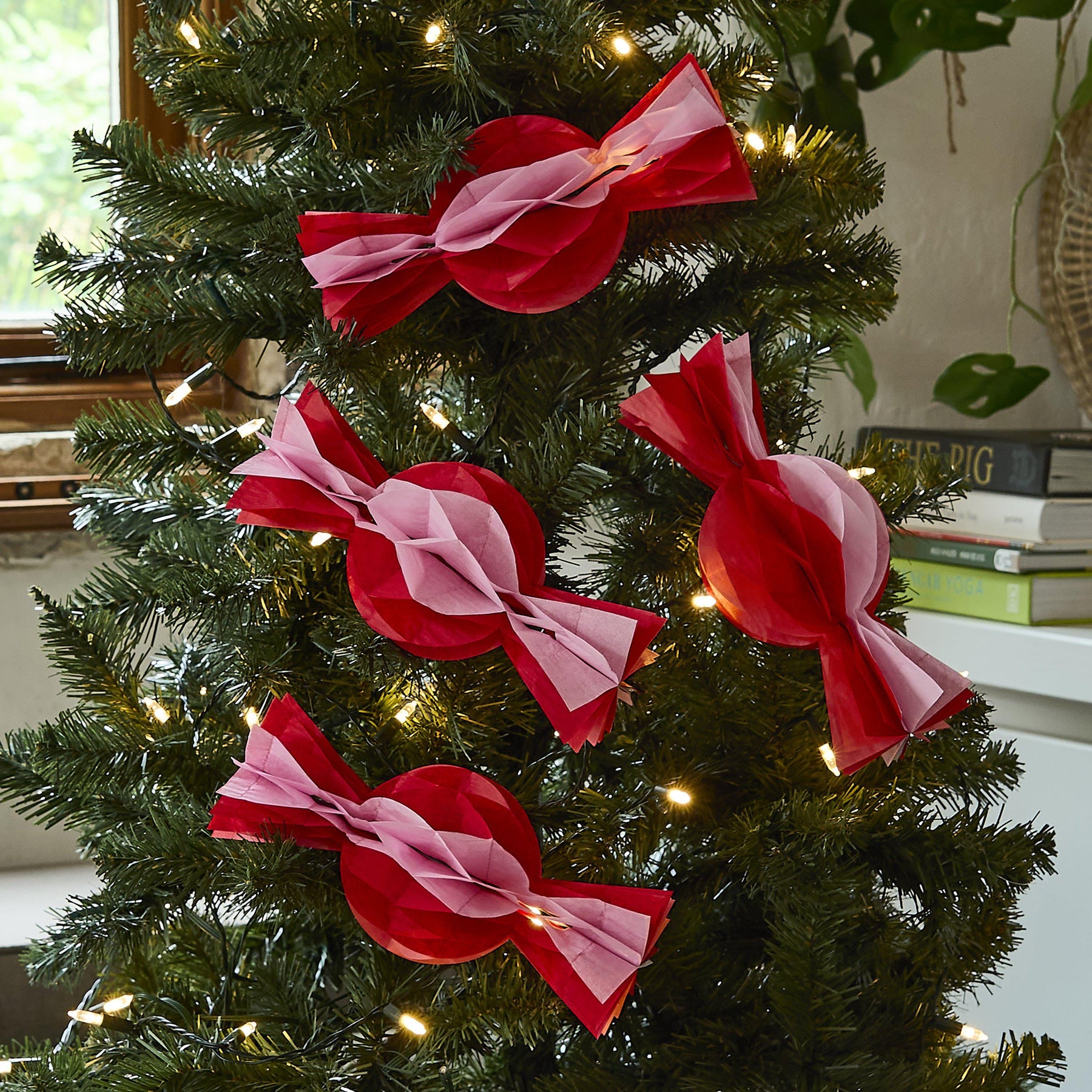 Add a pop of playful colour to your festive decor with these adorable pink and red honeycomb sweets decorations. This pack of four whimsical, candy-shaped decorations is a fun and modern twist on classic Christmas decor. They're perfect for creating a cheerful and celebratory atmosphere in any room.