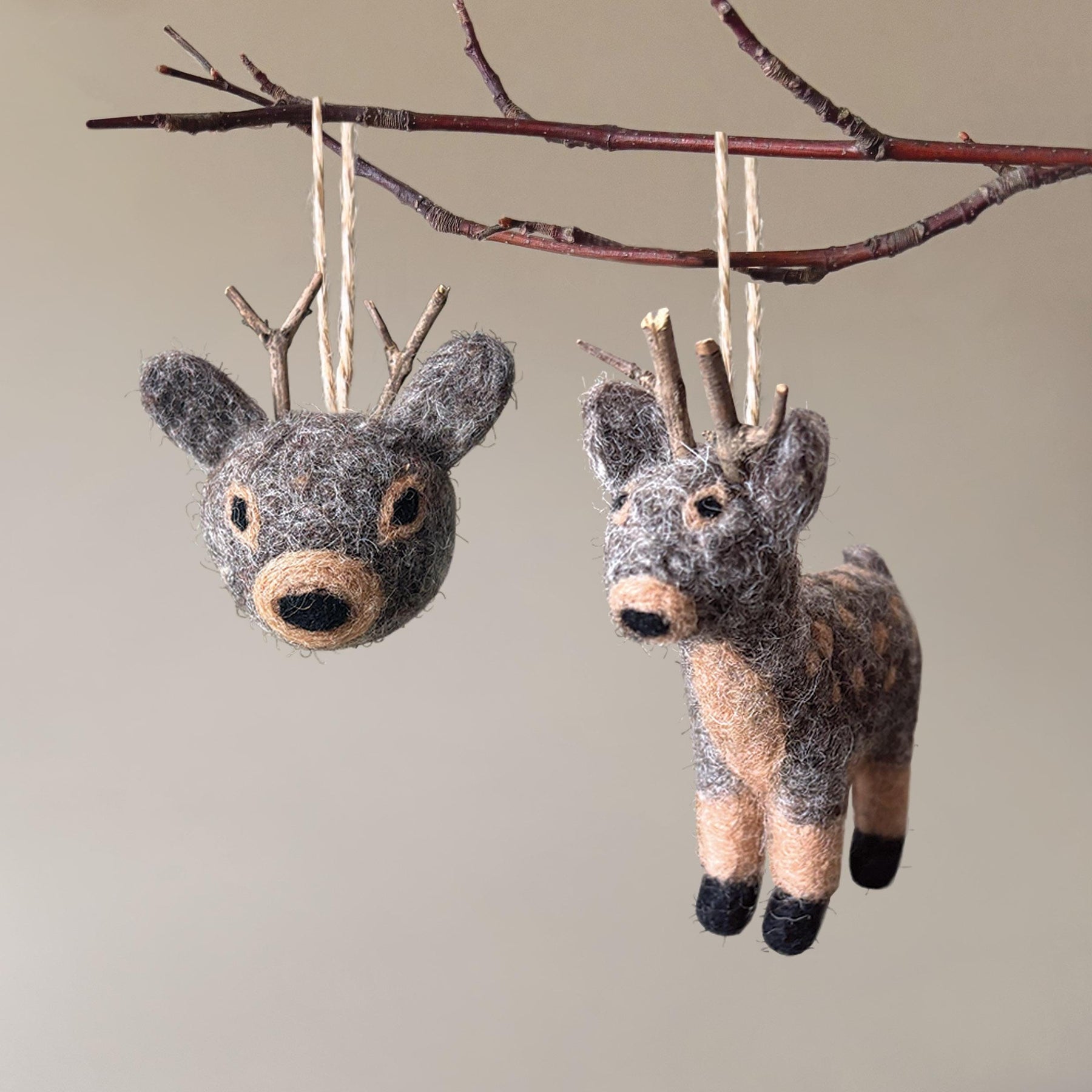 Add a touch of handcrafted charm to your holiday decor with our adorable Needle-Felted Reindeer Christmas Tree Decoration. This sweet, small-scale ornament is a perfect accent for any Christmas tree, holiday garland, or festive display. Each reindeer is lovingly made with a mix of brown and grey wool, giving it a beautifully textured, rustic feel. The tiny stick antlers add to its natural and whimsical appeal, making it a unique piece of holiday decor you'll cherish for years.