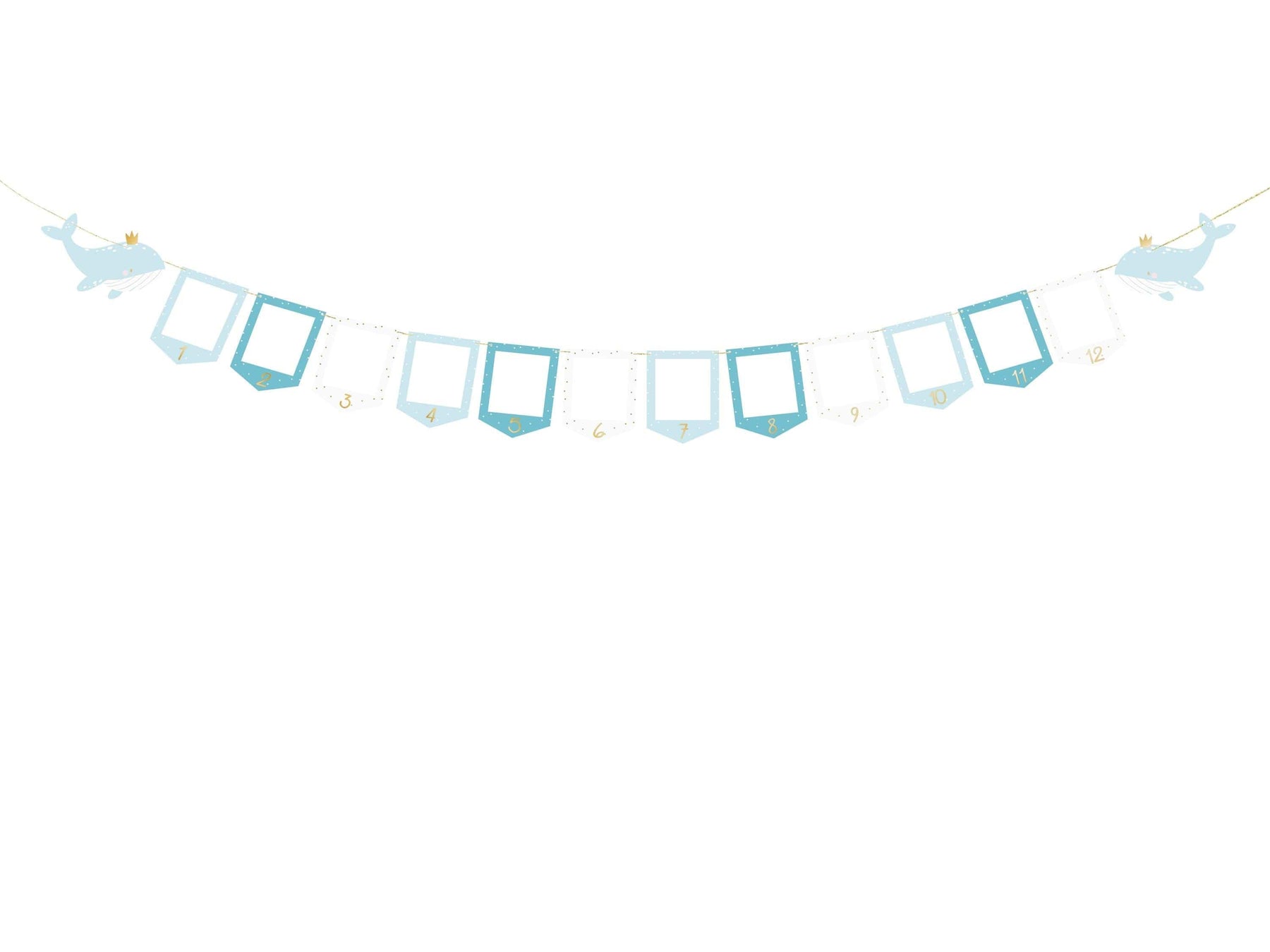 Celebrate your little one’s journey through their first year with our charming Blue & White Whale Picture Frame Garland. This adorable banner features 12 individual frames—one for every month—accented by two regal whales wearing golden crowns at each end. It is the perfect way to personalise a first birthday party or add a nautical touch to a baby boy's nursery.