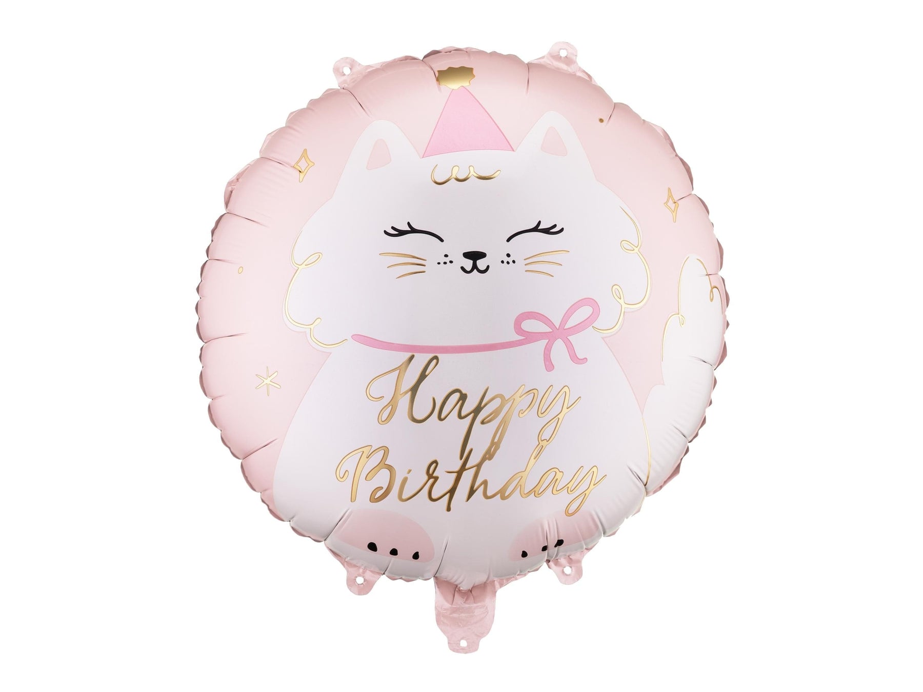 * Design: White kitty with pink party hat, bow, and gold foil "Happy Birthday" text.