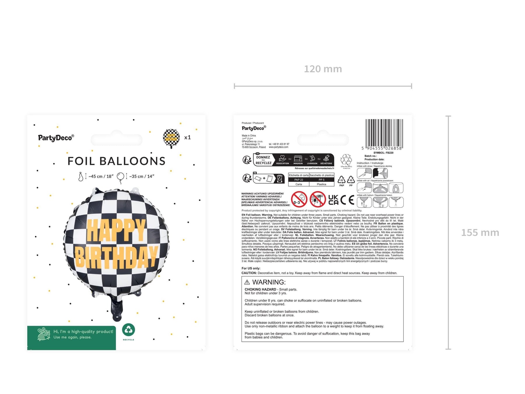 Foil balloon Checkered flag with inscription ''Happy Birthday'', mix of colours, size before inflation approx. 45 cm (18''), size after inflation approx. 35 cm (14''). Inflate with air and helium. Set contains a straw.