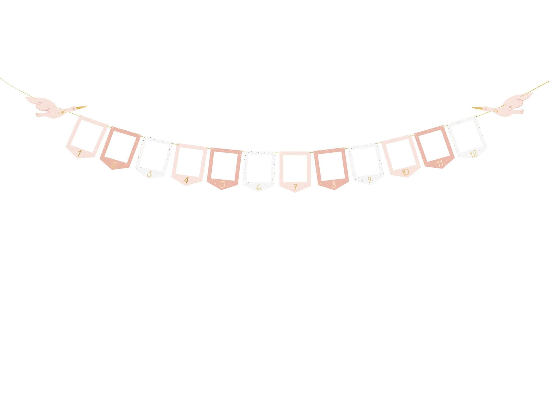 Pink & White Stork Picture Frame Garland - 12 Month Baby Milestone Banner - First Birthday Photo Display - New Baby Girl Nursery Decor - Jolie Fete UK
