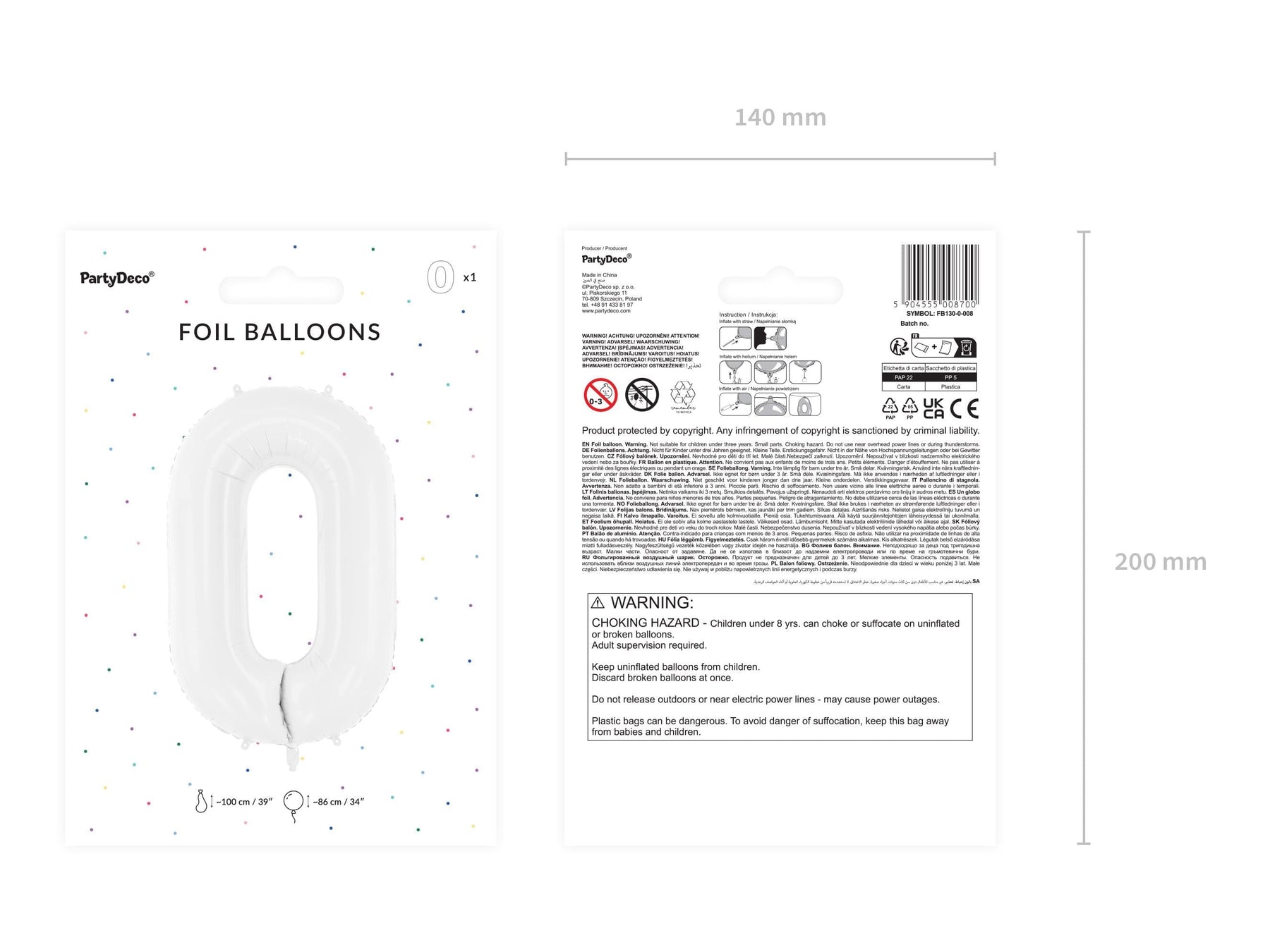 Matt foil Balloon Number 0 in white, size before inflating approx. 100 cm (39''), size after inflating approx. 86 cm (34''). To be inflated with air or helium. The set includes a straw. The balloon is self-sealing. It has hooks for easy attachment to decorations.